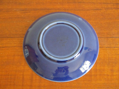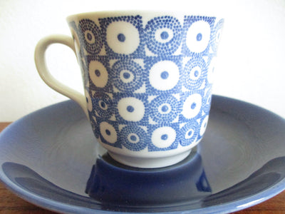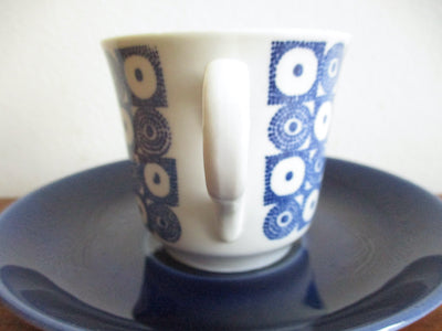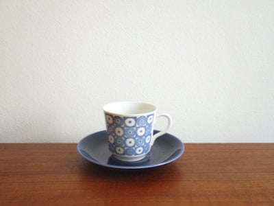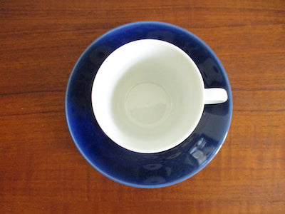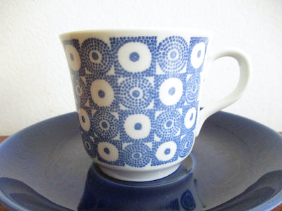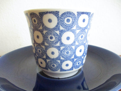 青い花のような、幾何学模様のような不思議なモチーフのデザイン。同時に可愛らしさも感じられるアイテムです。ソーサーの深みのある青が印象的です。
